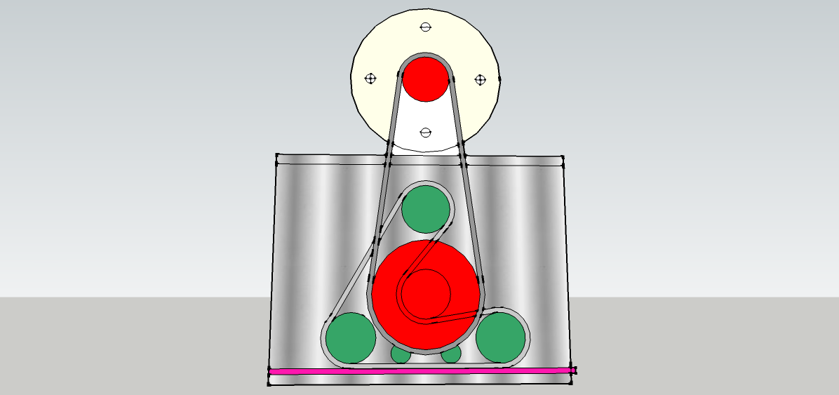 One vertical sideplate supports the entire drive mechanism – see picture. The drive motor sits over the top of the slide box and drives the big pulley on the outside. All the rest is inside the web of the RSJ ending up with the toothed belt driving onto the rack with a caterpillar drive to give more tooth contact. This plate is at the back of the machine and also supports a pair of Desoutter AFDK drills which just need a pulse from a 4mm air pipe to set them off on an automatic drilling excursion.