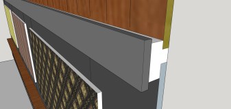 The lowest section takes on a colonial look with tongue and groove boards under a shelf. The point of this is that wires and pipes can be hidden as can tubes for integrated dust extraction. Fan coil units for heating and air-conditioning can be fitted into this space with the inlet and outlet vents facing down and hidden. If possible the height of this section should be like kitchen cupboards so that doors and hinges can be incorporated and some mini cupboards too. The underside of the lowest beam has a routed slot for another LED strip light which will highlight the lower panel which acts like a deep skirting board.