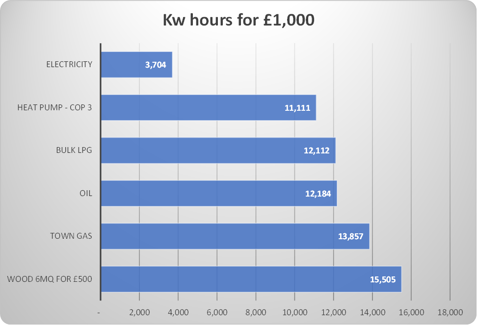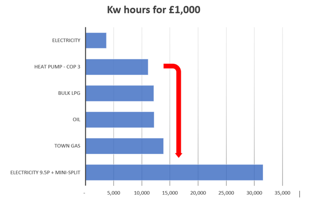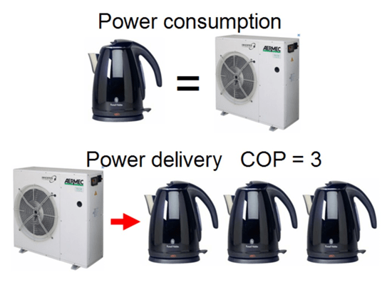 Typically consuming not much more power than an electric kettle the heat pump will deliver about 3 times as much energy to your heating, often more. The power is increasingly produced by renewables so the heat pump is an essential multiplier of green energy. That’s why we love them and that’s why we should have them.