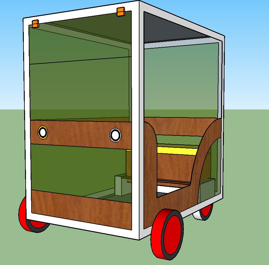 The ‘T’ slots enable panels of polycarbonate and plywood to be easily bolted on or slotted in. With a side profile of 1.2m x 1.2m at this stage it is still easily lifted off the kitchen table and with a plastic chair inside you can already sit in it. What makes it go?