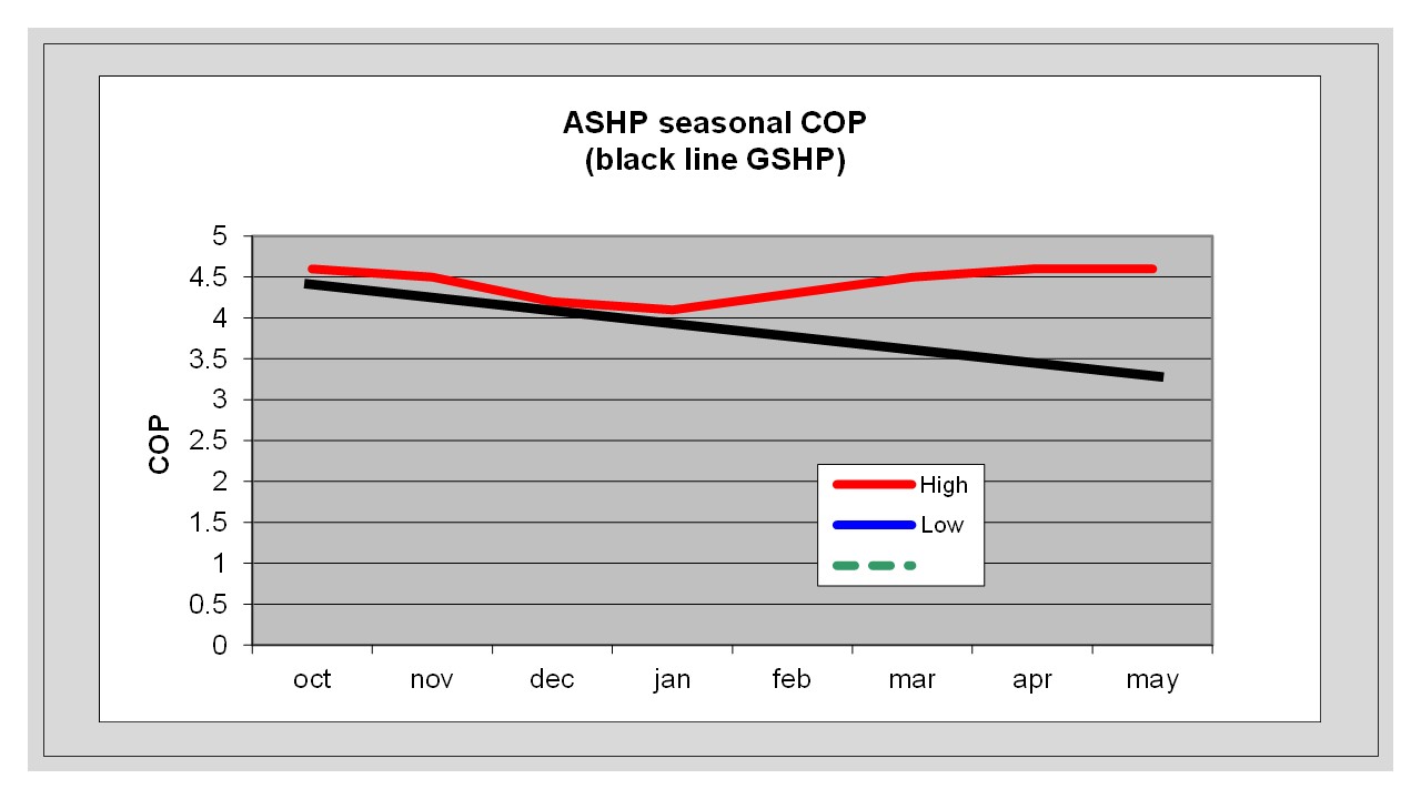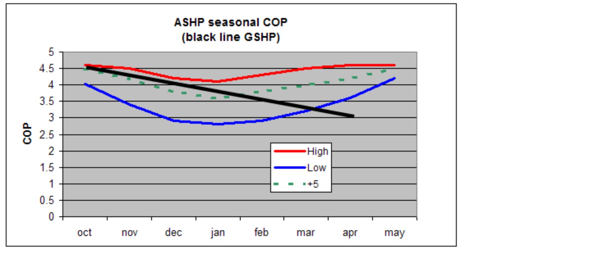 Have a look at this chart on heating costs for various house types to appreciate why a Passivhaus with a small heat pump and some fan-coil units could be the way to go. You’ll see that the ASHP can meet the Passivhaus demand for almost no cost. Indeed if the ASHP is connected to PV panels then the running cost of the house will be close to zero. This chart is out of date now but the message is the same.