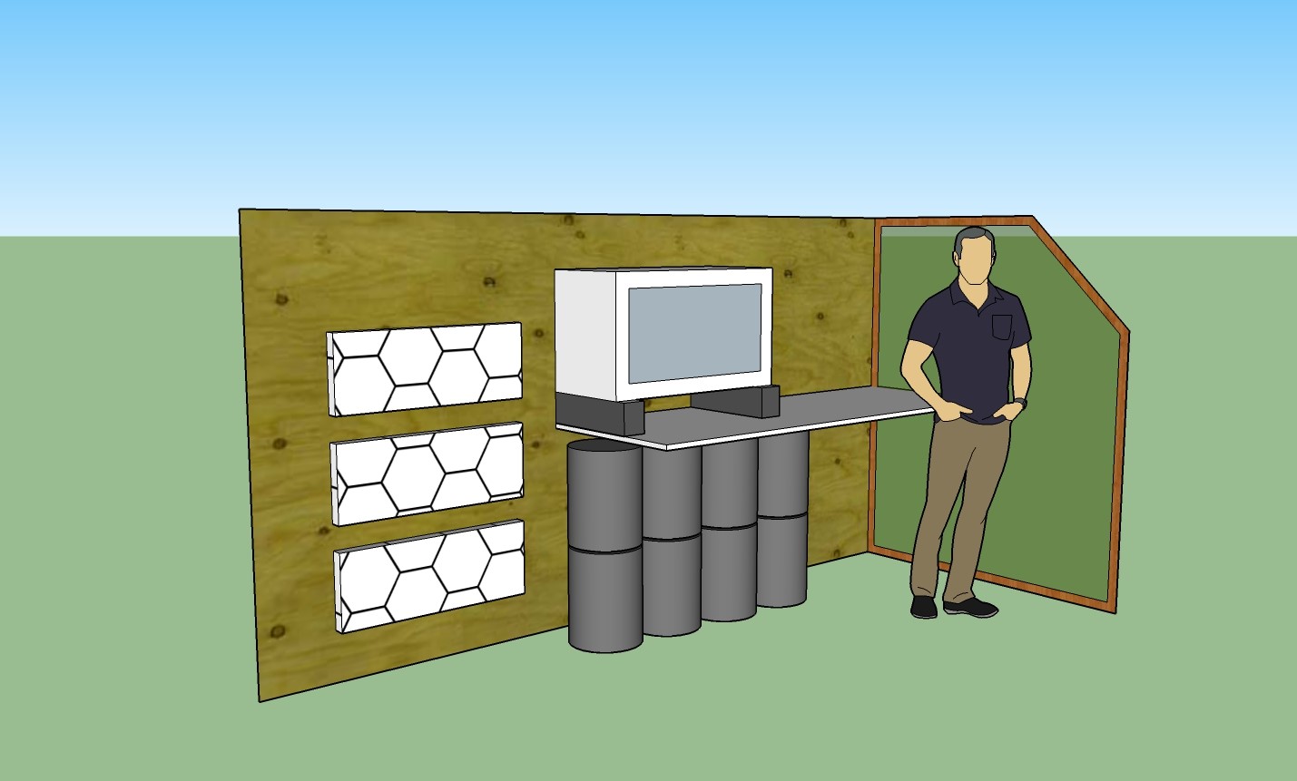 Lets assume that the low cupboard in this sketch is made of typical 720mm x 300mm kitchen carcass units, (just like your top cupboards). A pair of them (each 600mm wide) with a large slot cut out of the inner sides allows a 1000mm x 500mm x 70mm double radiator to fit inside (£48 Screwfix). Each of the top shelves is fitted just low enough to mount a 140mm fan from a computer (£10 – 20 Amazon etc) and these gently blow air past the radiator and out of the bottom. You can decide where the air inlet goes: probably top front but a wall panel channelling much warmer air from ceiling height is worth a thought. Note that this is much smaller and neater than the huge radiators you would be trading up to if you were trying to make a heat pump conversion work.