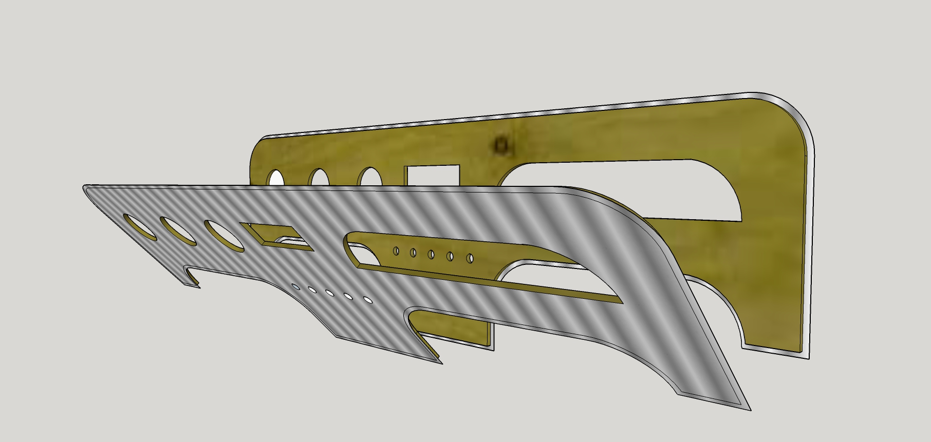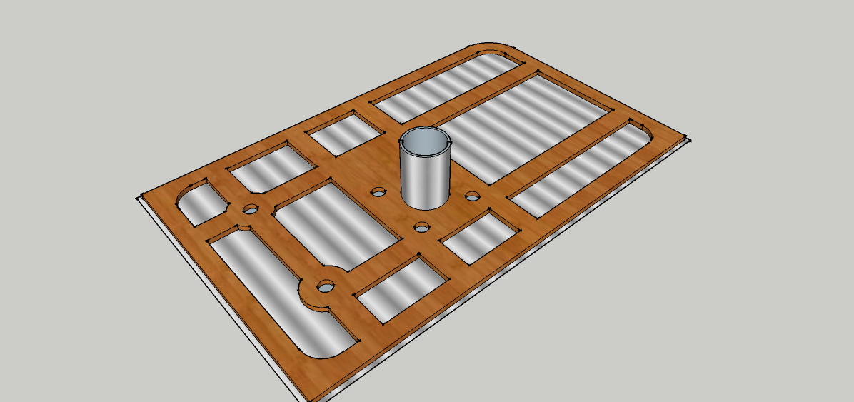 This centre console has side panels with appropriate slots inside to take flat slats across. With our trusty router we’d machine all the switch holes etc in the flat and then bend the ally to fit slats to slots. Wood veneer on the outside or ally? Decisions. You can see that an expensive looking centre console is actually just a trivial machining exercise done in a few minutes.