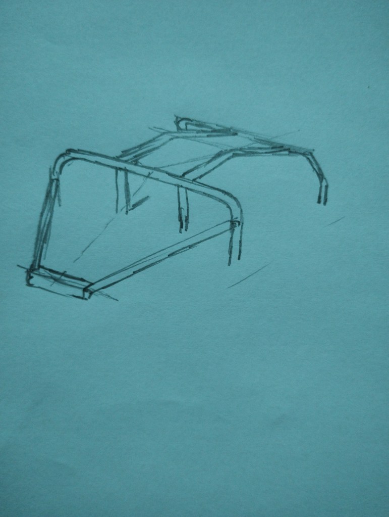 Very fast open top sports cars are downright dangerous. The trouble is you can arrive anywhere very suddenly, and at speed, which catches out other road users and increases the chance of an accident. So, I’d definitely want front and rear roll hoops. I’d go further with connecting tubes down the middle of the car roof to give a radical increase in rigidity. Then I’d do the usual wood and aluminium wrap around the tubes to get a targa top and I’d finish that off with openable and removable polycarbonate roof panels, as sketched previously – instant access for tall drivers at last. Of course, the inside of the roof panel would be machined to take a dash cam, switches and lights – just like a fighter jet then.