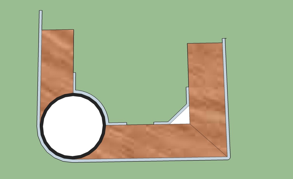 Machine a ‘V’ groove into the wood and the panel can be folded along that line using the aluminium as a hinge. This enables structures to be more than two dimensional and makes seamless direction changes possible. Rounder corners are also possible by wrapping the corner round a tube which is not only attractive but offers a useful conduit for wires, brake lines etc. You’ll see below that all the seams are folded inwards so that when the panels are bolted and glued together the outside finish is clean aluminium.