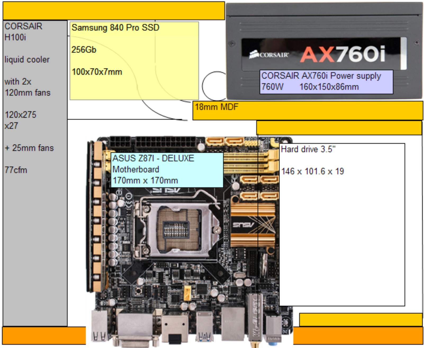 Imagine looking through a glass desk to a tidy water cooled PC that you built yourself. Here’s a basis for something that could be made by any PC building enthusiast. The simple MDF case is made by incorporating the Corsair water cooler and the externally mounted power supply. All the latest components are priced and drawn out in 3D.